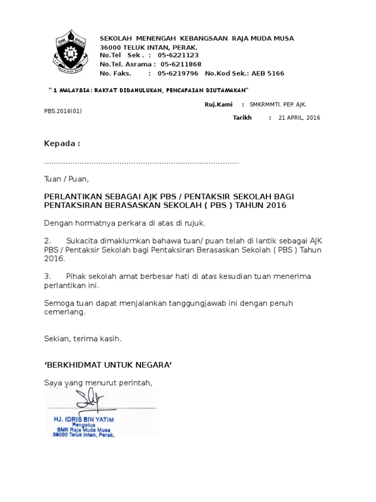 3 ajk pibg smttj sesi 2018 2019 pibg sttj 2018. Rujuk bab vi 3 lampiran 1 contoh surat permohonan penubuhan pasukan pakaian seragam kelabpersatuan dan kelab sukanpermainan jawatankuasa penaja. CONTOH SURAT LANTIKAN PENTAKSIR PBS SEKOLAH.